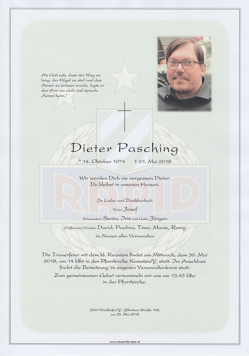Sehr geehrte Familie Pasching! Ich bin sehr bestürzt über den zu früheren Tot von Didi. Ich saß in der Berufsschule in Graz neben ihn und hatten immer Mega Spaß sicher auch weil wir eine eingeschworene Klasse waren . Ich wünsche Ihnen viel Stärke für die Zukunft Mit freundlichen Grüßen Helmut Pecsek GRAZ