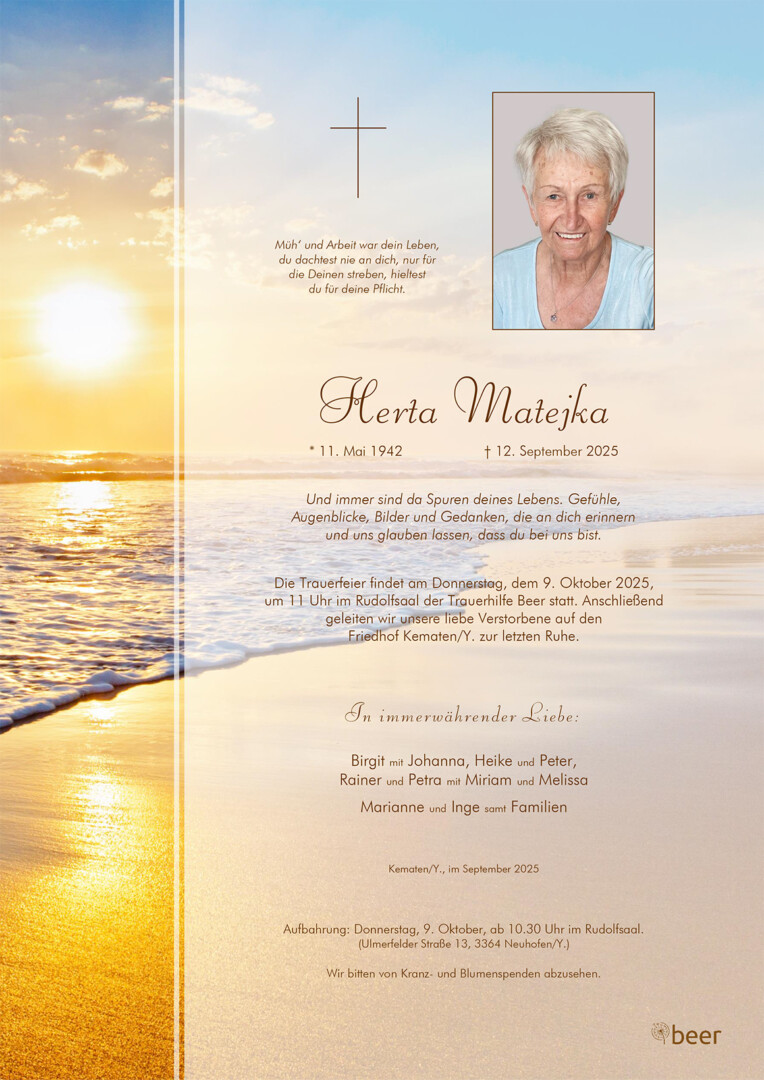 Liebe Herta, es ist so unvorstellbar, dass du nicht mehr da bist. Ich habe dich so sehr geschätzt, du hast immer ein offenes Ohr gehabt und warst eine so nette Frau. Wenn ich dein Foto sehe, sehe ich dich noch immer vor mir, deine nette und lustige Art. Ruhe in Frieden liebe Herta, ich werde dich nie vergessen.