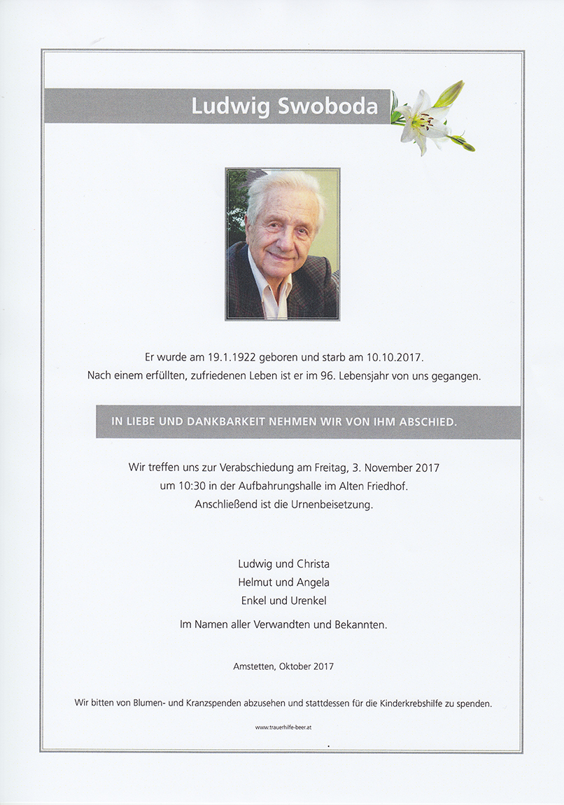 Herr Ludwig Swoboda war für mich ein guter Chef bis 1974. Aufrichtige Anteilnahme entbietet Traude, geb. Pichler
